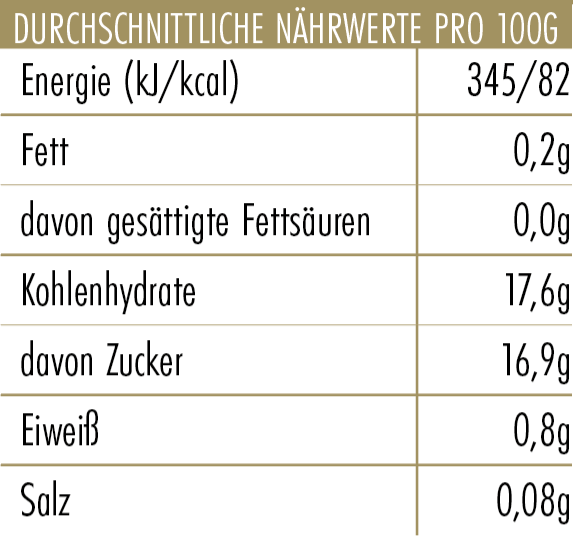 Himbeeren 40%, Wasser, Zucker, Dextrose, Holunderblütensirup 10%, Kartoffelfasern, Kartoffelstärke, Kartoffeleiweiß, Salz.